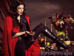 Rights-Managed photo of High fashion photo of a beautiful woman in red coat sitting on a festive table with a glass of wine in her hand Photo by Alex Maxim. This image is available for licensing for a variety of editorial and commercial uses in publications, designs, print and online.