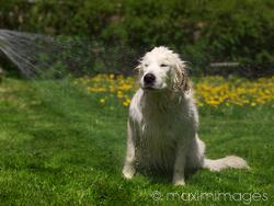 dog, golden retriever, pet, washing, bathing, shower, hose, spraying, spray, water, bath, wet, hot, refreshing, care, pets, animal, drops, lawn, animals, dogs, retriever, front view, backyard, back yard, grass, green, yard, outdoor, outdoors, one, summer, summertime, day, sunny, wash, hygiene, outside, caucasian, copyspace, copy space