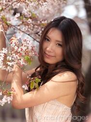 Rights-Managed photo of Portrait of a beautiful young smiling Asian woman standing at a blooming cherry tree in a park Photo by Alex Maxim. This image is available for licensing for a variety of editorial and commercial uses in publications, designs, print and online.