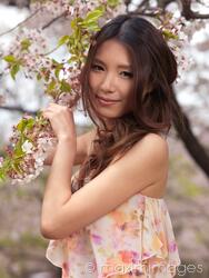 Rights-Managed photo of Portrait of a beautiful young smiling Asian woman standing at a blooming cherry tree in a park Photo by Alex Maxim. This image is available for licensing for a variety of editorial and commercial uses in publications, designs, print and online.