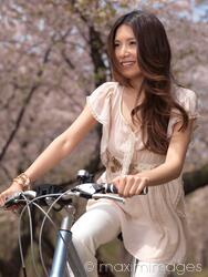 Rights-Managed photo of Young smiling Asian woman riding a bicycle in a park past blooming cherry trees Photo by Alex Maxim. This image is available for licensing for a variety of editorial and commercial uses in publications, designs, print and online.