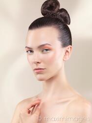 Descriptive keywords: beauty, face, woman, skin, portrait, beautiful, makeup, make up, soft, fresh, attractive, relaxed, serene, smooth, pastel, tones, color, colour, beige, young, colors, colours, make-up, hairstyle, hair style, hairdo, hair-style, hair-do, styling, artistic, one person, head and shoulders, clean, updo, braiding, creative, light, coral, pink, yellow, eyeshadow, eyeshadows, eye shadows, eye shadow, isolated, white, copyspace, copy space, beige background, studio shot, closeup, close up, faces, women, people, brunette, caucasian, portraits, sensuality, feminine, looking at camera, eye contact, twentysomething, twenty, twenties, 20s, 20-30, 20