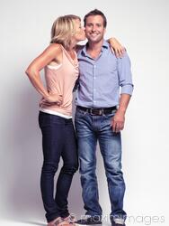Descriptive keywords: fashion, man, woman, couple, fashionable, style, stylish, kissing, people, young, male, female, smiling, smiles, embracing, cheek, kiss, hugging, clothes, clothing, wearing, dressed, jeans, denim, jeanswear, pants, blue, smile, positive, portrait, mid adult, adults, mid adults, adult, casual, casually, fashionably, real people, real person, real, two, two people, standing, together, friends, friendship, siblings, brother, sister, twins, studio shot, isolated, white, gray, gray background, white background, caucasian, thirties, front view, full length, full body, thirtysomething, thirty, twenties, twentysomething, 20s, 30s, 20-30, looking at each other, happy, posing