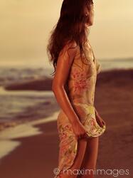 Rights-Managed photo of Young woman in wet summer dress on a beach at sunset Photo by Alex Maxim. This image is available for licensing for a variety of editorial and commercial uses in publications, designs, print and online.