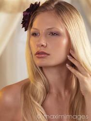 Rights-Managed photo of Portrait of a beautiful young woman with a flower in her blond hair Photo by Alex Maxim. This image is available for licensing for a variety of editorial and commercial uses in publications, designs, print and online.