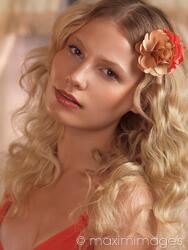 Rights-Managed photo of Portrait of a beautiful young woman with a flower in her blond hair Photo by Alex Maxim. This image is available for licensing for a variety of editorial and commercial uses in publications, designs, print and online.