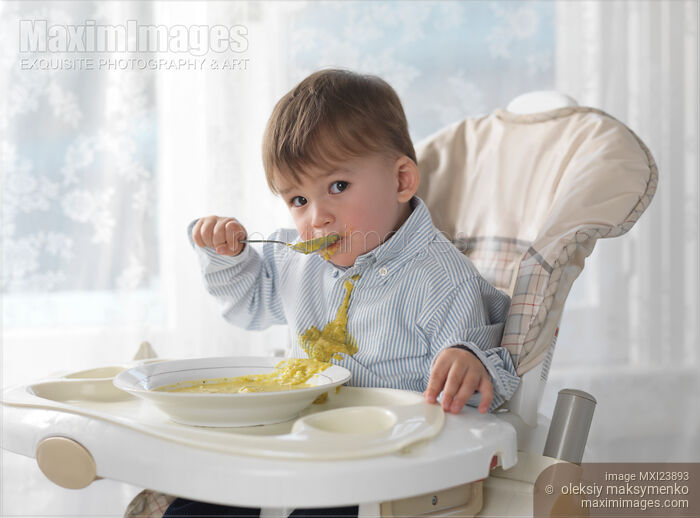 Royalty-Free photo of One and a half year old boy sitting in a high chair and eating soup with a spoon, spilling it on his shirt Photo by Oleksiy Maksymenko. This image is available for licensing for a variety of editorial and commercial uses in publications, designs, print and online.