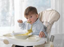 One and a half year old boy sitting in a high chair and eating soup with a spoon, spilling it on his shirt You can buy a license or prints of this high-resolution, high-quality photo suitable for large-size publications, large-format prints and posters.