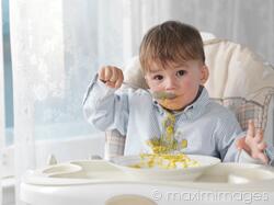 Cute baby boy sitting in a high chair and eating soup with a spoon, spilling it on his shirt MaximImages.com