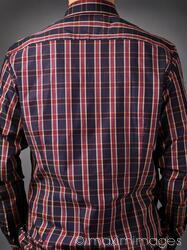 shirt, man, back, wearing, tartan, pattern, dark, red, dressed, clothes, rear, rear view, clothing, style, stylish, trendy, fashionable, dress shirt, collared shirt, collar shirt, young, mens, fashion, hipster, black, blocks, body parts, body part, torso, detail, details, male, one person, shirts, patterned, squares, color, colour, colors, colours, fancy, people, men, closeup, close up, hipsters, background, caucasian, young adult, adult, abstract, unrecognizable, thirties, thirtysomething, twenties, twentysomething, 30, 30s, 20-30, 20s, copyspace, copy space