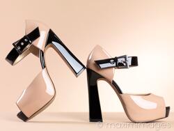 Descriptive keywords: shoes, accessories, high heels, high heel, high-heel, pumps, footwear, platform shoes, open-toe, beige, thick-heel, fashion, trendy, fashionable, open toe, platforms, patent leather, beige background, color background, colored background, black, shiny, womens, women, sandals, accessory, style, heels, stylish, product, pair, artistic, products, object, objects, still life, nobody, studio shot, isolated, copyspace, copy space
