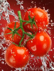 Fresh juicy cluster tomatoes, tomatoes on the vine in a big splash of water You can buy a license or prints of this high-resolution, high-quality photo suitable for large-size publications, large-format prints and posters.