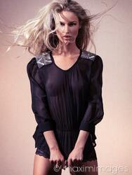 Rights-Managed photo of Fashion photo of young beautiful woman with flying long blond hair wearing black see-through top on beige background Photo by Alex Maxim. This image is available for licensing for a variety of editorial and commercial uses in publications, designs, print and online.