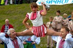 Rights-Managed photo of Two men in traditional Ukrainian clothes supporting a woman gymnast with a kettlebell. Kiev, Ukraine, Eastern Europe. Photo by Oleksiy Maksymenko. This image is available for licensing for a variety of editorial and commercial uses in publications, designs, print and online.