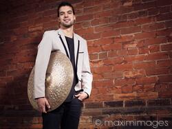 Royalty-Free photo of Artistic portrait of a smiling young man musicial holding a ride cymbal standing at a brick wall Photo by Alex Maxim. This image is available for licensing for a variety of editorial and commercial uses in publications, designs, print and online.