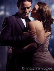 Rights-Managed photo of Artistic sensual photo of a couple standing in front of a window on a rainy night. Man in suit taking off young woman's dress. Photo by Alex Maxim. This image is available for licensing for a variety of editorial and commercial uses in publications, designs, print and online.