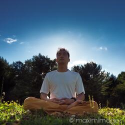 Rights-Managed photo of Chinese man meditating outdoors during sunrise in the nature, sitting with crossed legs on grass under blue sky with the sun behind him. Buddhist meditation. Instructor Shi Chang Dao, Toronto Shaolin Temple STQI. Photo by Alex Maxim. This image is available for licensing for a variety of editorial and commercial uses in publications, designs, print and online.