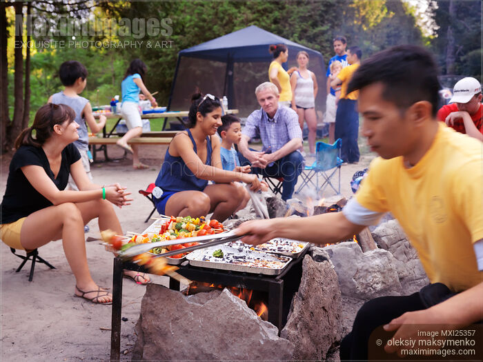 Group of people of different ethnicities enjoying themselves sitting around a fire at a camp site in a park. Ontario, Canada.