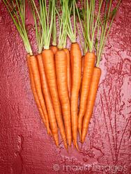 Royalty-Free photo of Bunch of juicy orange organic carrots on red background, artistic food still life Photo by Oleksiy Maksymenko. This image is available for licensing for a variety of editorial and commercial uses in publications, designs, print and online.