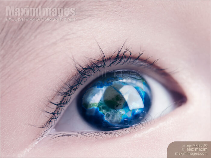 Royalty-Free photo of Closeup of a child's blue eye with the Earth globe, world map reflecting in it Photo by Alex Maxim. This image is available for licensing for a variety of editorial and commercial uses in publications, designs, print and online.