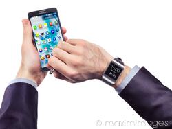samsung, watch, galaxy, gear, smartphone, phone, note, iii, 3, using, smartwatch, person, man, male, hands, hand, holding, android, phones, smartphones, display, screen, isolated, white, white background, cutout, cut out, cut-out, wearing, studio shot, electronics, device, technology, business, business person, business man, businessman