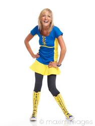 happy, woman, girl, smiling, laughing, portrait, positive, female, costume, dress, boots, shoes, colors, colours, yellow, blue, smile, smiles, standing, fun, blond, blonde, front, front view, full body, full length, studio, studio shot, white, white background, caucasian, humorous, 30s, thirties, thirtysomething, twentysomething, twenties, 20-30