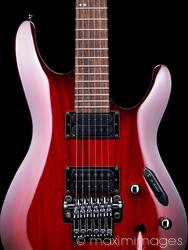 Descriptive keywords: guitar, electric, red, ibanez, closeup, detail, details, instrument, musical, music, instruments, guitars, close up, strings, pickup, pickups, humbucker, modern, wood, wooden, black, isolated, black background, studio, studio shot, object, single object, single, only, objects, front view, tremolo, nobody