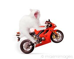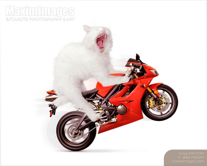 Rights-Managed photo of Humorous concept of a white cat doing a wheelie on a red sports motorcycle, isolated on white background Photo by Alex Maxim (Oleksiy Maksymenko). This image is available for licensing for a variety of editorial and commercial uses in publications, designs, print and online.