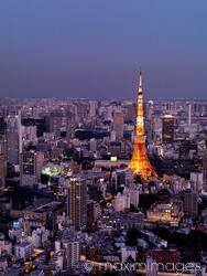 Rights-Managed photo of Tokyo tower in twilight. Tokyo, Japan. Photo by Alex Maxim. This image is available for licensing for a variety of editorial and commercial uses in publications, designs, print and online.