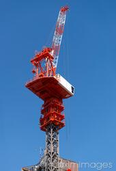 Descriptive keywords: crane, cranes, construction, tower, high-rise, highrise, machinery, equipment, blue, sky, red, nobody, outdoor, outdoors, day, japan, japanese, copyspace, copy space, isolated