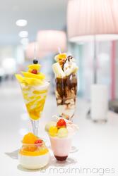 Four glasses with parfait on a cafe table in Japan MaximImages.com