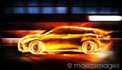 Royalty-Free photo of Covered in burning flames sports car racing along a tunnel, side view Photo by Alex Maxim. This image is available for licensing for a variety of editorial and commercial uses in publications, designs, print and online.