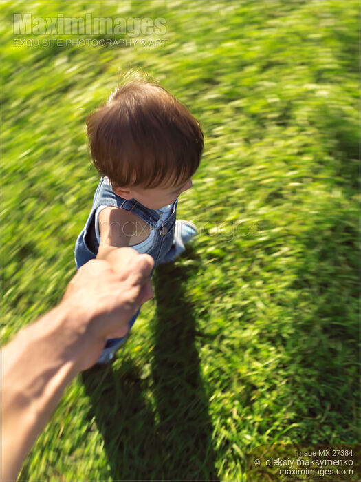 One year old child running on the grass holding his father's hand, artistic dynamic photo with motion blur.
