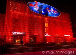 Descriptive keywords: theatre, red, theater, china, beijing, legend, kungfu, kung fu, exterior, outdoor, outdoors, night, illuminated, asia, tourist attraction, tourist attractions, building