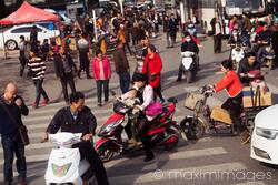 Royalty-Free photo of People riding scooters and pedestrians at an intersection in Zhengzhou, Henan, China 2014 Photo by Alex Maxim. This image is available for licensing for a variety of editorial and commercial uses in publications, designs, print and online.