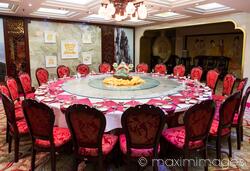 Royalty-Free photo of Banquette table at Chan Wu hotel in DengFeng, Zhengzhou, Henan Province, China Photo by Alex Maxim. This image is available for licensing for a variety of editorial and commercial uses in publications, designs, print and online.