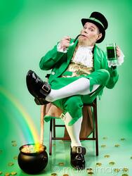 Leprechaun in green clothes holding a smoking pipe and a mug of green beer with a rainbow coming from a pot full of gold. Conceptual St. Patrick's holiday portrait. You can buy a license or prints of this high-resolution, high-quality photo suitable for large-size publications, large-format prints and posters.