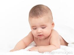 Rights-Managed photo of Portrait of a cute thoughtful four month old baby boy looking down. Isolated on white background. Photo by Alex Maxim. This image is available for licensing for a variety of editorial and commercial uses in publications, designs, print and online.