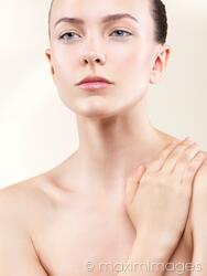 Rights-Managed photo of Beauty portrait of a young woman face with clean natural look, subtle makeup and perfect, porcelain white, fair skin on light beige background. Photo by Alex Maxim. This image is available for licensing for a variety of editorial and commercial uses in publications, designs, print and online.