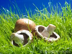 Cremini mushrooms in green grass under bright sunny sky Food still life You can buy a license or prints of this high-resolution, high-quality photo suitable for large-size publications, large-format prints and posters.