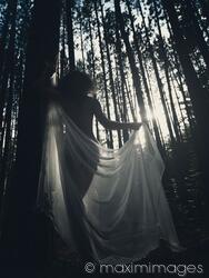 Rights-Managed photo of Shadowy artistic nude photo of a silhouette of a woman in soft dreamy sunlight walking throught a pine forest with a white translucent shawl Photo by Alex Maxim. This image is available for licensing for a variety of editorial and commercial uses in publications, designs, print and online.