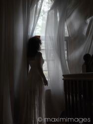 Descriptive keywords: woman, window, standing, room, looking, out, near, home, light, dramatic, inside, interior, waiting, curtains, curtain, drapes, flying, wind, women, person, dress, dark, dim, sinister, artistic, spooky, alone, single, female, girl, back, rear, rear view, moody, haunted, paranormal, mysterious, mystery, people, young, indoors, indoor, white, sunlight, caucasian, adult, brunette