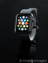 Shiny steel Apple Watch series 2 smartwatch with app icons on display isolated on black background You can buy a license or prints of this high-resolution, high-quality photo suitable for large-size publications, large-format prints and posters.