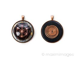 Orgonite pendant spiritual healing stone with the flower of life design on the front and copper wire spiral on the back isolated on white background You can buy a license or prints of this high-resolution, high-quality photo suitable for large-size publications, large-format prints and posters.
