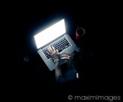 High angle view photo of a woman using a laptop computer at night. The woman is sitting at a desk in complete darkness with only the light from the screen illuminating her unrecognizable silhouette. MaximImages.com