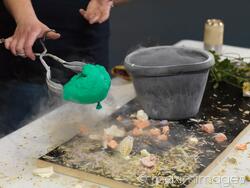 Person taking a shrunk air balloon out of a container with liquid nitrogen, demonstrating the way gas inside the balloon shrinks in volume MaximImages.com