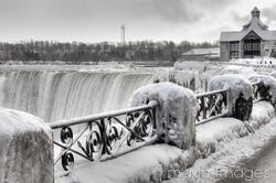 niagara falls, waterfall, winter, snow, frozen, barrier, ice, icy, frost, cold, wintertime, street, niagara, canada, ontario, white, dramatic, gloomy, atmospheric, fence, outdoor, outdoors, scene, scenery, view, horseshoe, canadian, fall, falls, hoarfrost, hoar frost, beautiful, viewpoint, water, landmark, sights, travel, destination, tourist attraction, dull, artistic, parapet, outlook, storm, gray, grey, sky, north america, american