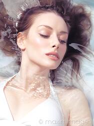 Rights-Managed photo of Beauty portrait of a young beautiful woman with natural look makeup lying in shiny clear water. Artistic closeup of woman's face. Soft light colors and fresh feel. The image depicts the concept of beauty treatment, skin care or spa. Photo by Alex Maxim. This image is available for licensing for a variety of editorial and commercial uses in publications, designs, print and online.