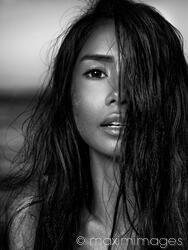 Rights-Managed photo of Sensual black and white beauty portrait of a young woman exotic mixed-race ethnicity face with long dark hair and sand particles on her hair and skin. Outdoors beach settings with sea water in the background. The young female model is of mixed ethnicity and is in her early twenties. Photo by Alex Maxim. This image is available for licensing for a variety of editorial and commercial uses in publications, designs, print and online.
