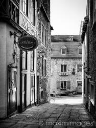 Descriptive keywords: quebec, city, old, architecture, street, streets, small, houses, buildings, house, shop, shops, sign, signs, tradition, pains benits, pains bénits, pains-bénits, rue, boutique, boutiques, stone, day, daytime, historic, culture, heritage, historical, french, canada, canadian, ville de québec, québec, detail, details, ruelle, travel, destination, destinations, town, outdoor, outdoors, exterior, outside, sites, sights, sight, black and white, monochrome, grayscale, views, cultural, history, north america, north american, nobody, empty
